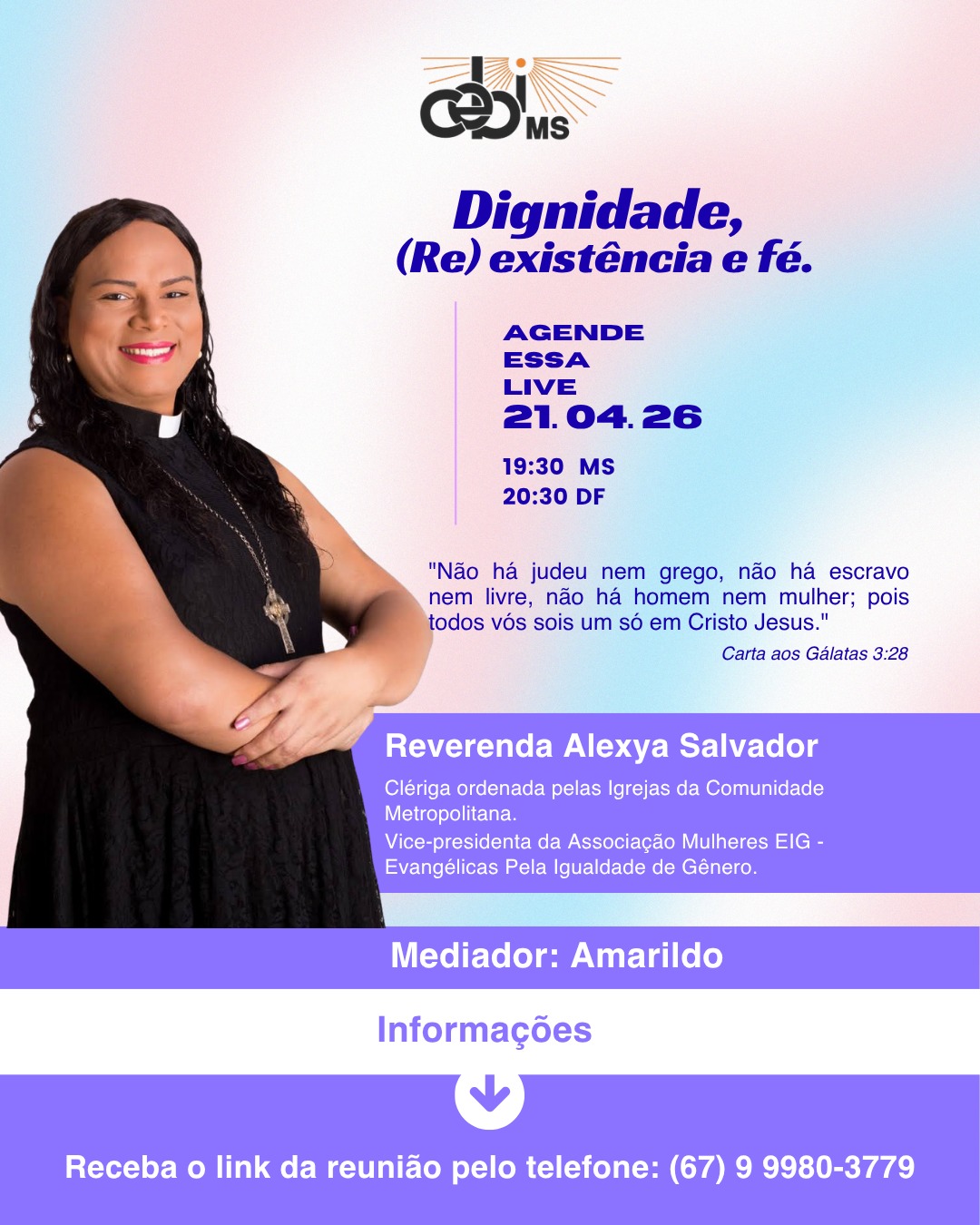 “Não há judeu nem grego, não há escravo nem livre, não há homem ou mulher; pois todos vós sois um só em Cristo Jesus” (Gl 3,28) Com a facilitadora: Reverenda Alexya Salvador Clérica ordenada pelas Igrejas da Comunidade Metropolitana Vice-presidente da Associação Mulheres EIG – Evangélicas pela Igualdade de Gênero Inscrições: (67) 9980-3779 |